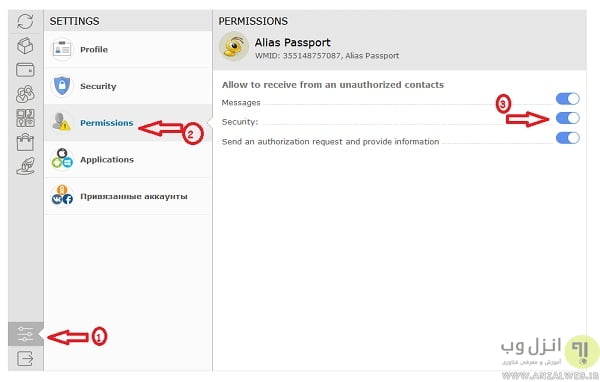 اما قبل از اینکه شناسه کیف پول خود را در اختیار فرد دیگر قرار دهید شما می بایست مشخصات حساب خود را درست کنید تا بتوانید پول دریافت کنید و برای اینکار روی گزینه settings و بعد روی شکل شماره یک در تصویر زیر کلیک کرده و permissions را انتخاب و security را فعال کنید